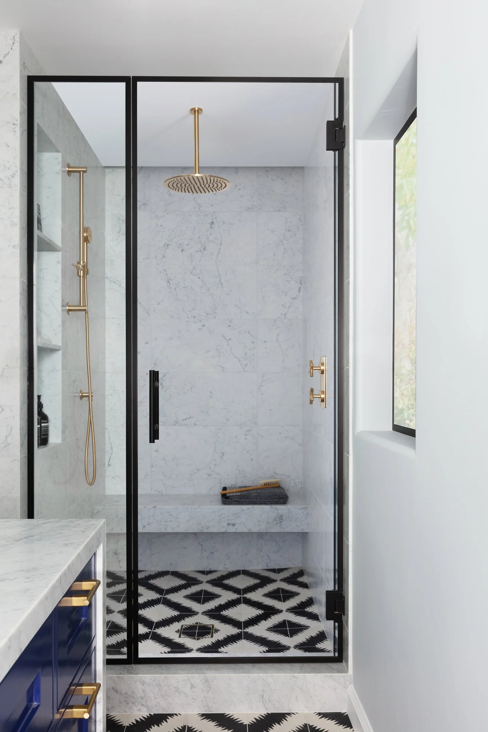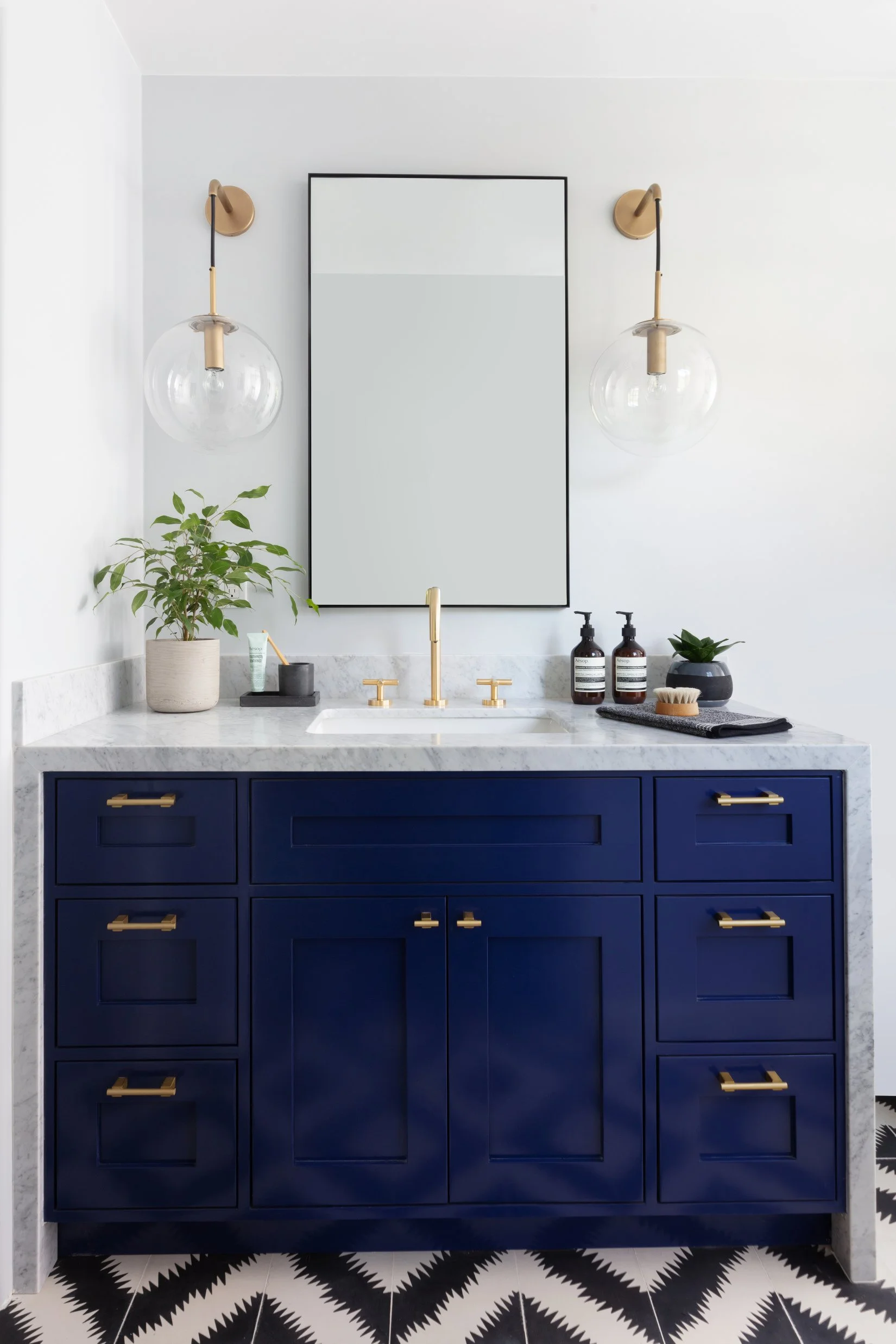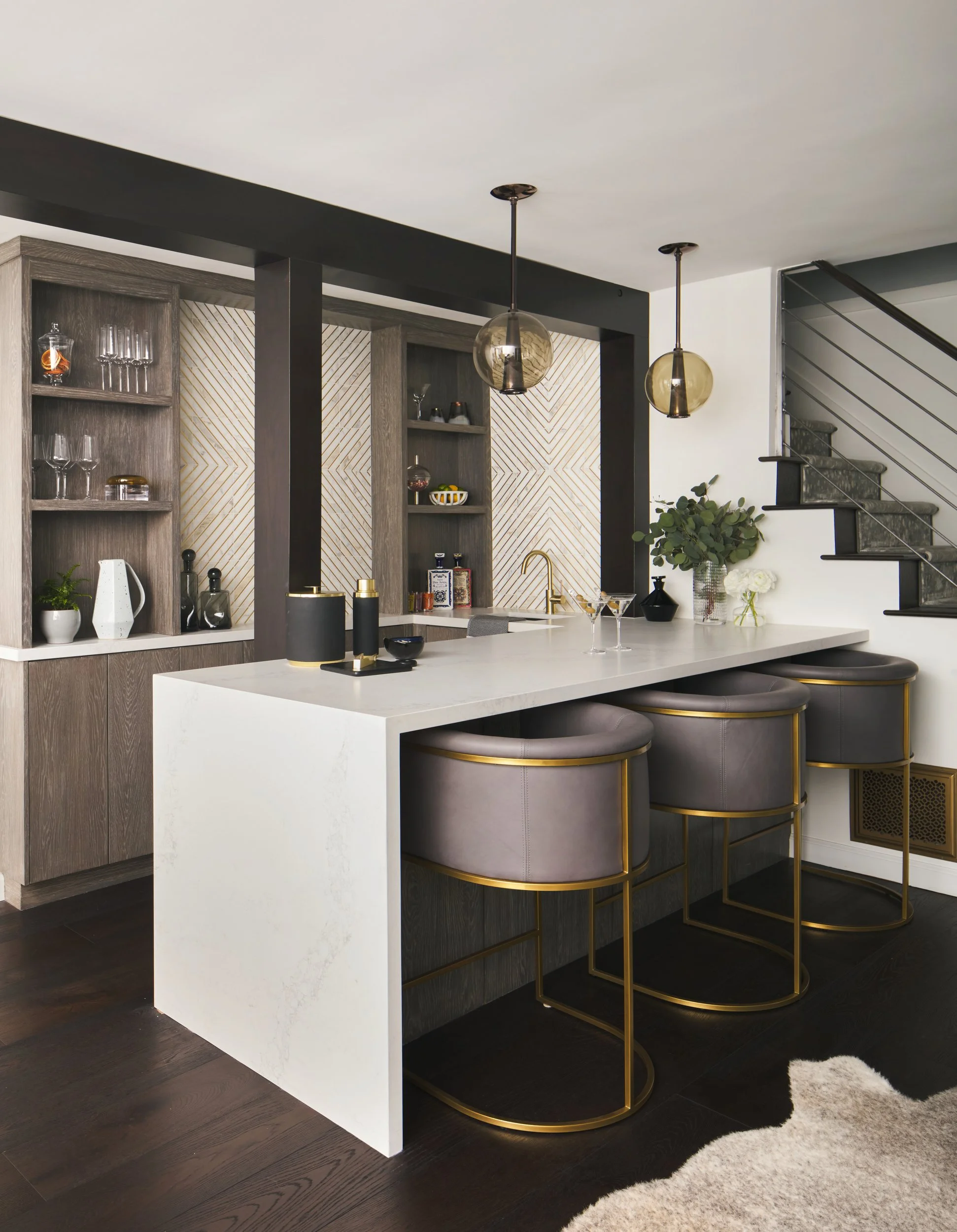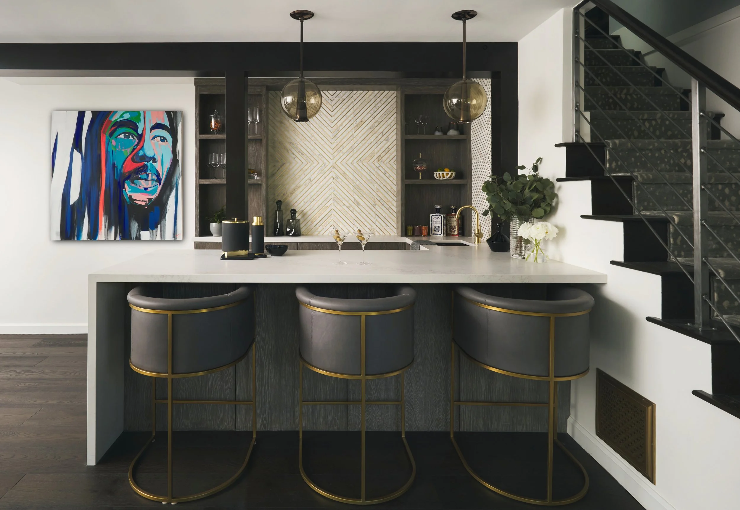 A client in the Hollywood Hills had a vision to create an eclectic bar area and update a bathroom. The design blended bold design choices with timeless craftsmanship. The bar area features rich textures, statement lighting, and custom shelving and cabinetry that gives the space a unique, edgy, and inviting atmosphere, perfect for entertaining. In the bathroom, we carried the eclectic aesthetic through with patterned tile, gold fixtures, and creative accents that add personality and charm. The result is a cohesive yet distinct transformation that’s full of character and function.